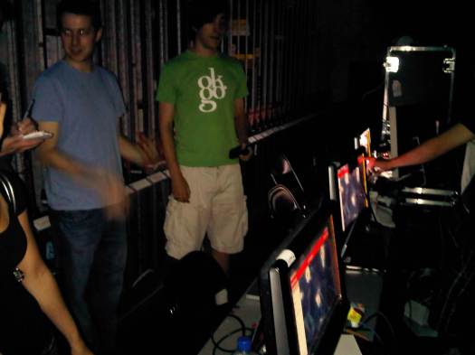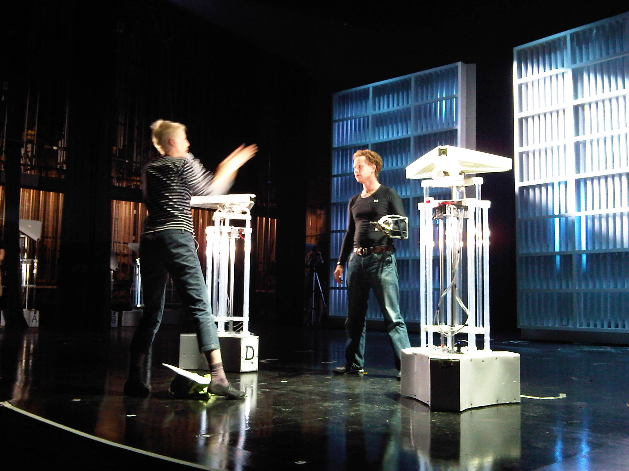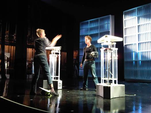 Yesterday, I watched in awe as Karole and Hal worked through his dance with two of his robot creations. He ran across the stage as a robot sped forward to greet him, then moved down stage to leap playfully back and forth between two robots, twirling 360 degrees in the air and interacting with each robot. Some thirty feet overhead, a team of robot controllers furiously kept up, programming each robot to carry out its whirls and bobs, making the changes Karole required for each iteration. At one point, a robot conked out in the middle of its performance and had to quickly exit the stage to be replaced by a sibling. Although comprised of abstract forms – a triangular “head” mounted atop slender pillars of clear lucite, the robots are surprisingly characterful. One couldn’t help think the first robot seemed dejected as it rolled off stage, while its identical understudy sped onto stage seemingly eager to strut its stuff.