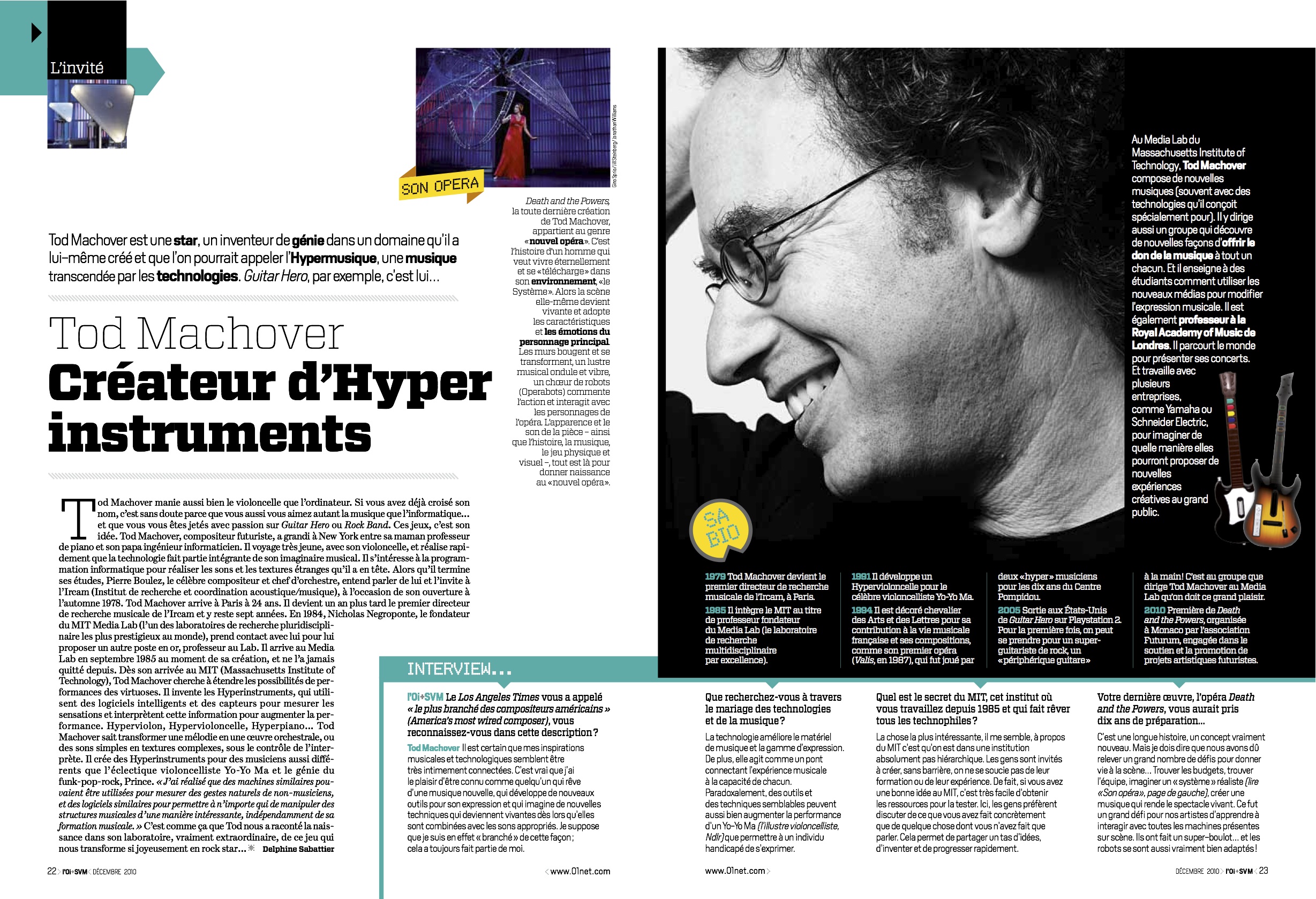 The French technology magazine l’Ordinateur individuel-SVM just published an article “Tod Machover: Créateur d’Hyperinstruments.” The two-page spread describes the evolution of hypersintruments, from IRCAM days to Yo-yo Ma and Guitar Hero. It includes a time line. Nice! Download a pdf of the article.