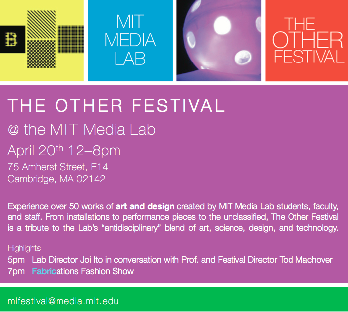 Posted on April 14, 2013 by BlogMeisterThe Other Festival at the MIT Media Lab – April 20, 2013 Coming next Saturday at the MIT Media Lab! Open to the community. Download the flyer here: The Other Festival. Share this: Click to email a link to a friend (Opens in new window) Email Click to share on Facebook (Opens in new window) Facebook Click to share on X (Opens in new window) X Click to share on LinkedIn (Opens in new window) LinkedIn Related