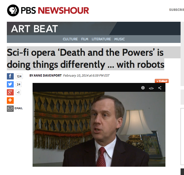 Excellent PBS Newshour interviews with Dallas Opera general director and CEO Keith Cerny, Death and the Powers team members Ben Bloomberg and Peter Torpey, and composer Tod Machover. Cerny talks about why he wanted to bring “Death and the Powers” to the Winspear Opera House and produce the global simulcast.