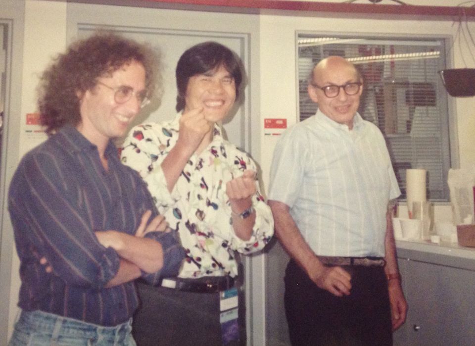 Incredible photo just sent to me by Margaret Minsky, of me with Yoichiro Kawaguchi and Marvin Minsky, at the MIT Media Lab around the time of the premiere of FLORA in 1990. Marvin introduced the two of us, and we collaborated on this computer music/video piece via Fax between Cambridge and Tokyo. Still one of my favorite pieces; listen to it athttp://tinyurl.com/HearFlora — with Marvin Minsky.
