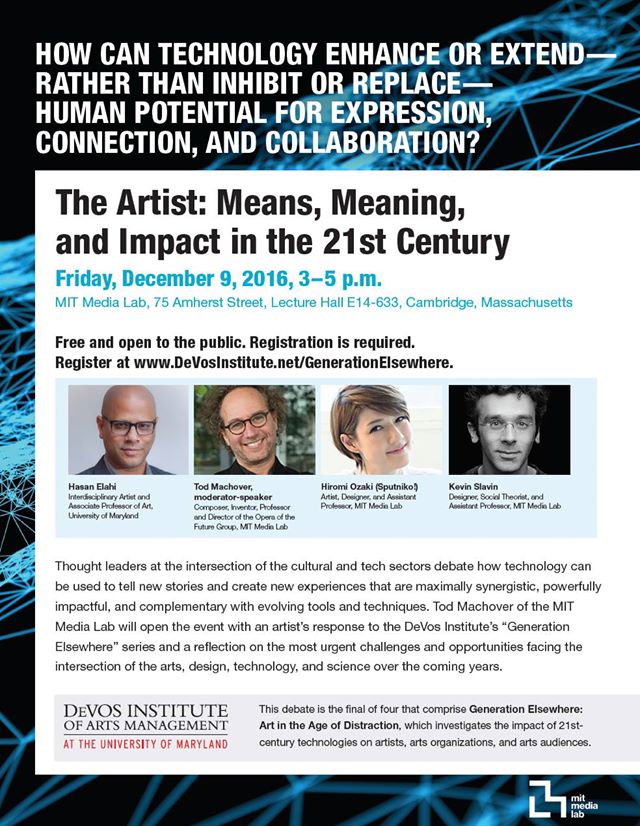 Interesting “debate” at the MIT Media Lab on Dec.9 that Tod Machover be moderating and speaking at – “The Artist: Means, Meaning and Impact in the 21st Century”. Final event of the DeVos Institute series on “Generation Elsewhere: Art in the Age of Distraction”. Full info and registration at www.devosinstitute.net/GenerationElsewhere. Press release at http://web.media.mit.edu/~tod/media/pdfs/The-Artist_Means-Meaning-Impact_PressRelease.pdf.