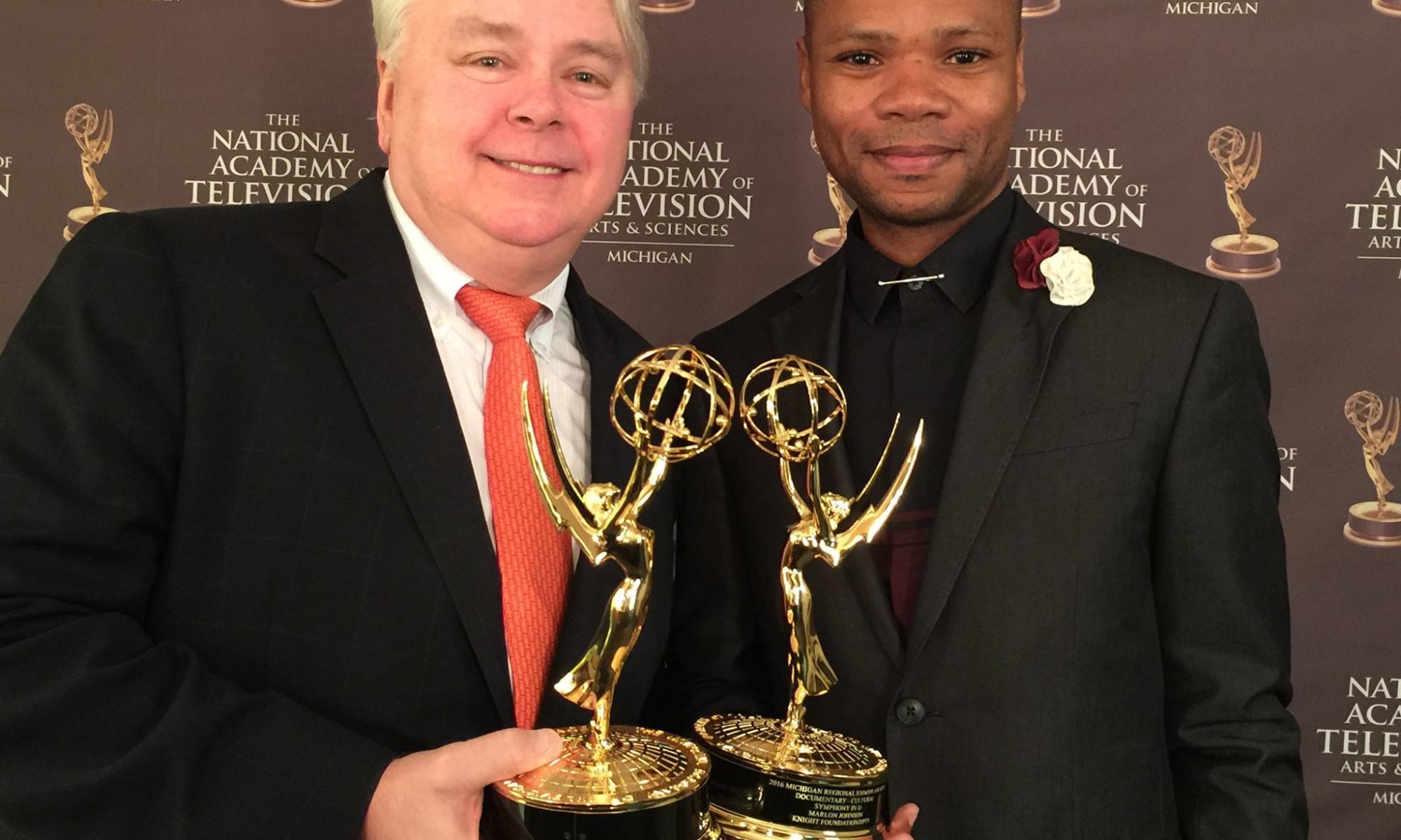 Congratulations to Dennis Scholl, Marlon Johnson and Tod Machover for taking home an Emmy for Best Cultural Documentary for the film of SYMPHONY IN D at the Michigan Emmy Awards last night! Check out the trailer above. Dennis Scholl and Marlon Johnson picked up the awards in Detroit (photo below). Tod had to stay home to work on his next opera, but he wrote to his co-producers: “Congratulations to the whole team. This was such a great collaboration, one I will never forget.”