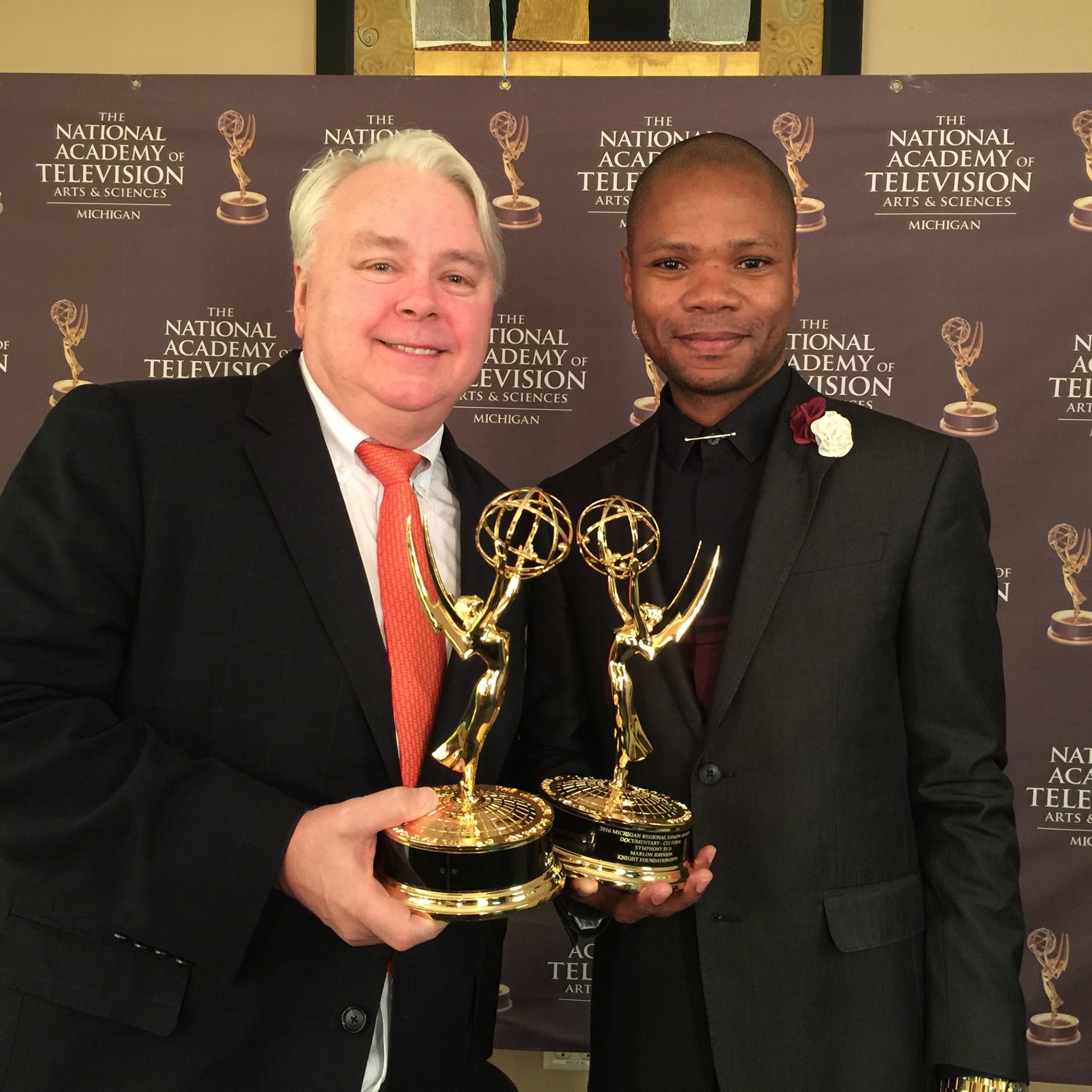 Congratulations to Dennis Scholl, Marlon Johnson and Tod Machover for taking home an Emmy for Best Cultural Documentary for the film of SYMPHONY IN D at the Michigan Emmy Awards last night! Check out the trailer above. Dennis Scholl and Marlon Johnson picked up the awards in Detroit (photo below). Tod had to stay home to work on his next opera, but he wrote to his co-producers: “Congratulations to the whole team. This was such a great collaboration, one I will never forget.”