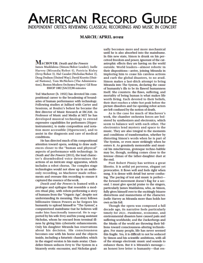American Record Guide, a magazine of independent music criticism, has published this laudatory review in its March/April 2022 issue of the new Death and the Powers recording from the Boston Modern Orchestra Project. Here’s an image of the article for those of you who don’t have a subscription. (And we encourage you to subscribe! High quality arts reviewing is a dying industry and needs readers’ support!)